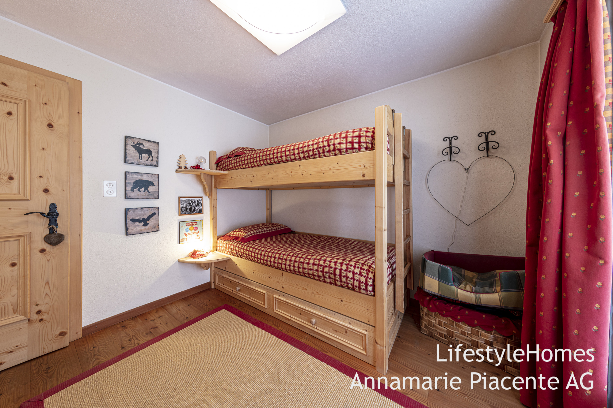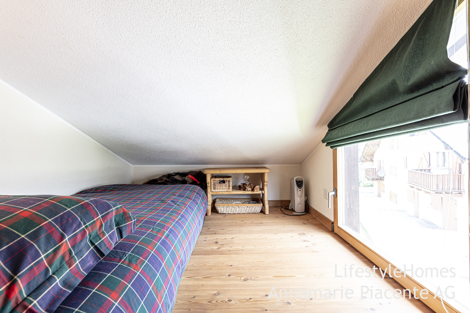 Die Wohnung verfügt über einen gemütlichen Wohnbereich mit Essplatz, eine separate Küche, zwei Schlafzimmern sowie zwei Nasszellen. Vom Kinderzimmer aus erreichen Sie den gedeckten Balkon. Im Dachgeschoss befindet sich ein romantisches "Heidizimmer", welches vom Wohnzimmer aus über eine Treppe erreichbar ist.