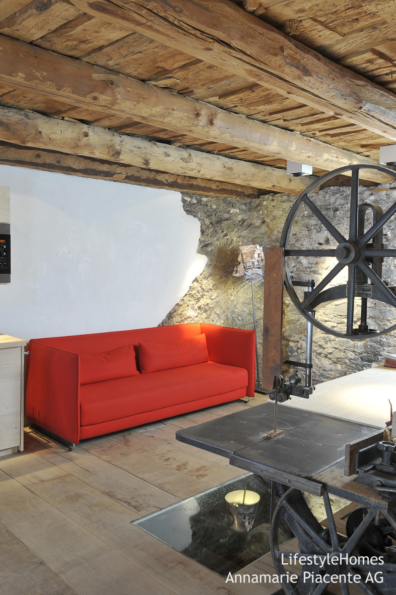 Die ersten Skier und Räder wurden in der kleinen aber beheizten Werkstatt eine weitere Etage tiefer gebaut und die Vorbesitzer wohnten dazwischen mit fliessendem Kaltwasser, wobei der gewölbte Steinraum gegen den Berg als Kühlschrank und der Kamin als Heizung genutzt wurden.