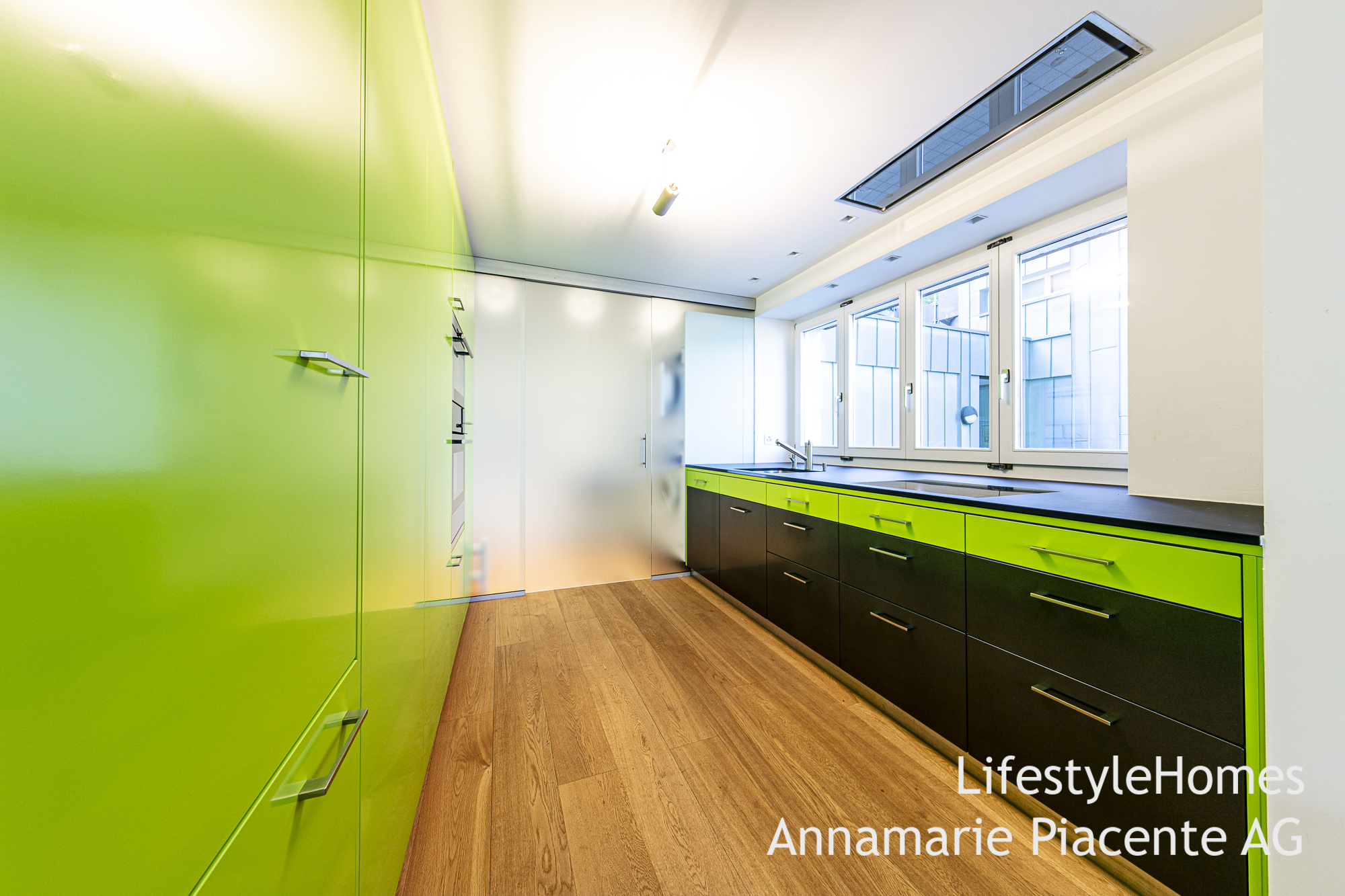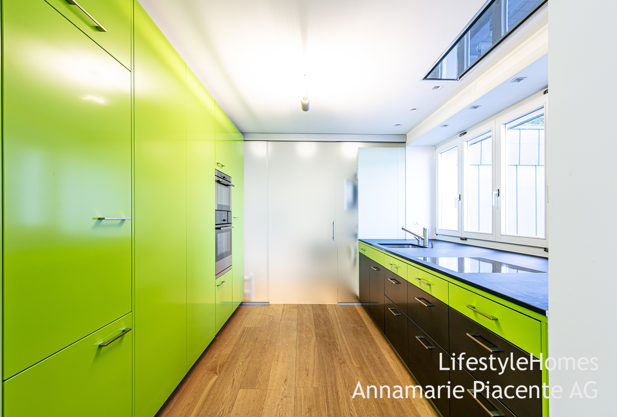 Treten Sie ein in den grosszügigen Eingangsbereich mit Garderobeeinbauschrank. Und weiter in den offenen Wohn- und Essbereich. Die moderne, hochwertige Küche präsentiert sich in grün-antrazit und schwarzer Glasabdeckung. Alle Geräte sind von gehobener Qualität. Zusätzlich ist neben der Küche, abgetrennt durch eine Glaswand, eine Waschküche vorgesehen.
