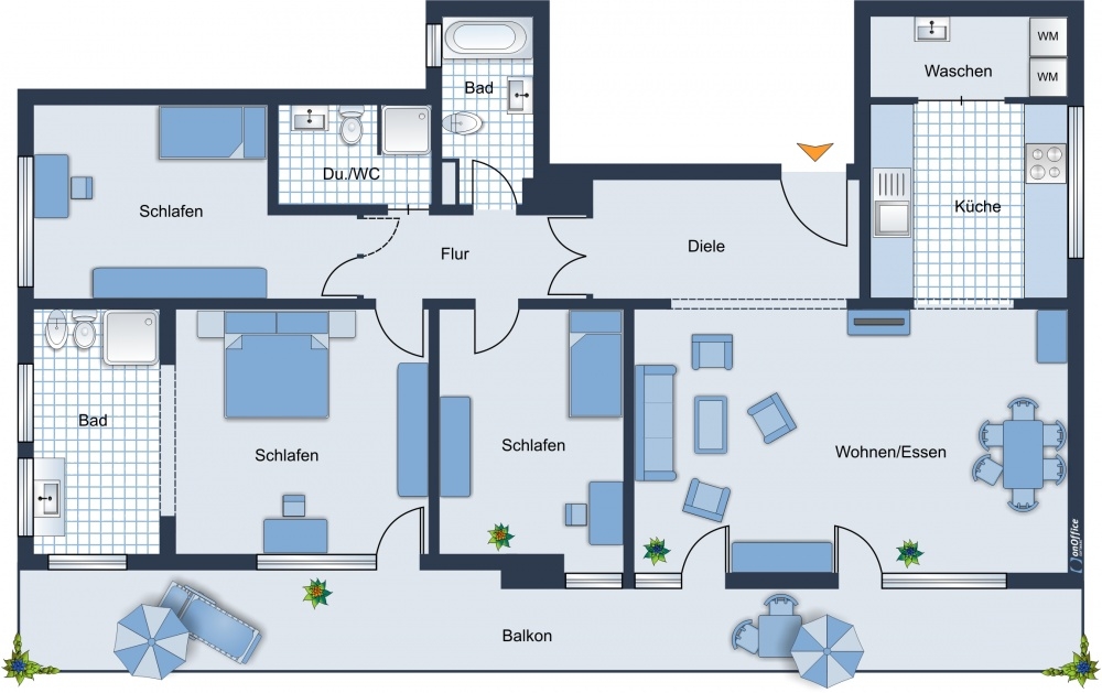 Weiter verfügt die Wohnung über drei Schlafzimmer. Eines mit Zugang zum Balkon sowie angrenzendem Bad mit Dampfdusche und Bidet. Ein weiteres mit direktem Zugang zum Duschbad. Ein zusätzliches Badezimmer mit Whirlpool ist vom Gang im Schlafbereich erreichbar.