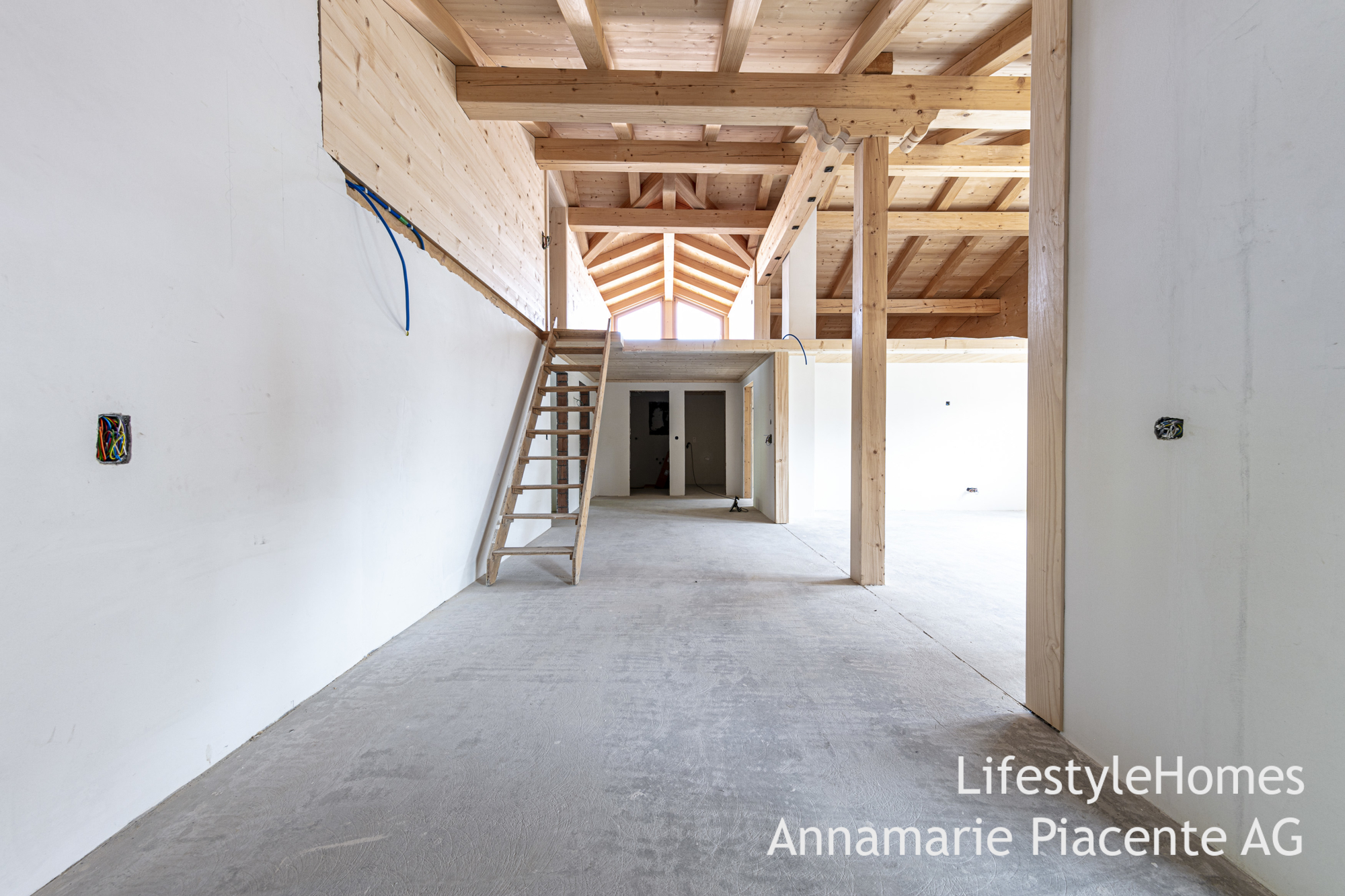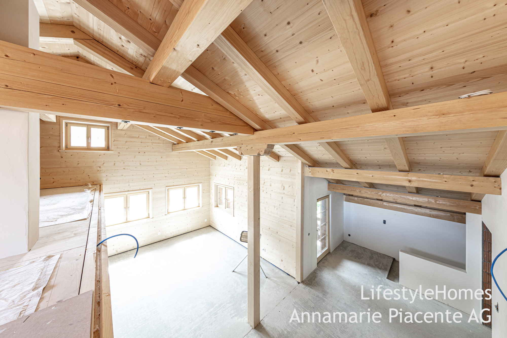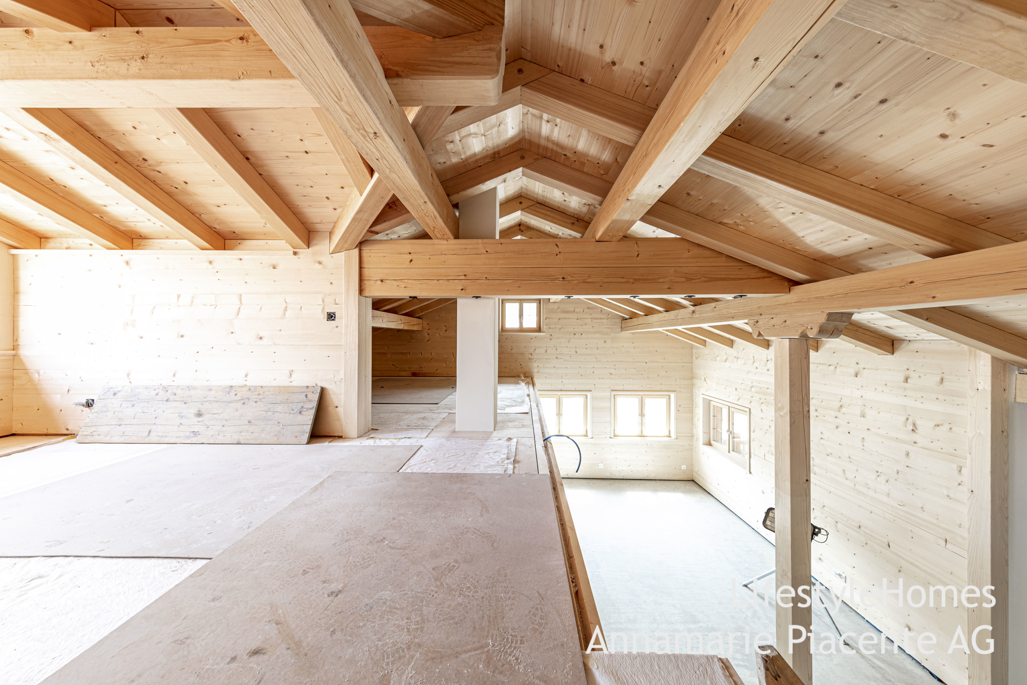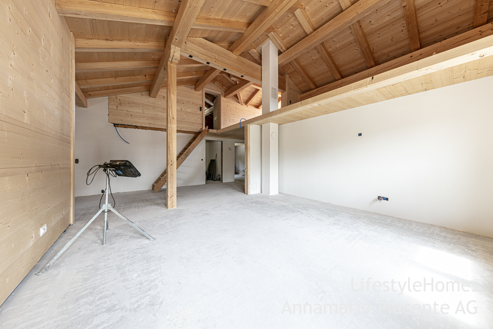 Im 2. Ober- und Dachgeschoss befindet sich eine offene 5.5-Zimmer-Maisonettewohnung, welche sich zum Teil noch im Rohbau befindet. Herzstück dieser Wohnung ist der offene und hohe Wohnbereich mit Galerie. Weiter verfügt die Maisonette über eine geräumige Küche mit Essbereich, vier Schlafzimmer sowie zwei Nasszellen. Die Räume sind hoch mit sichtbarer Holzkonstruktion.